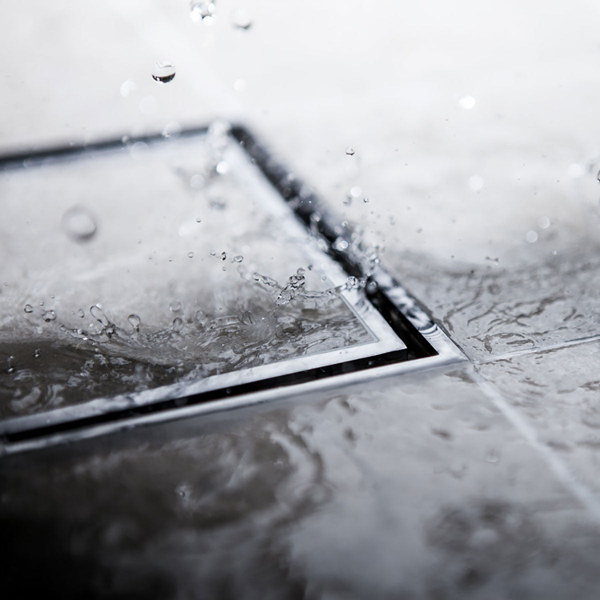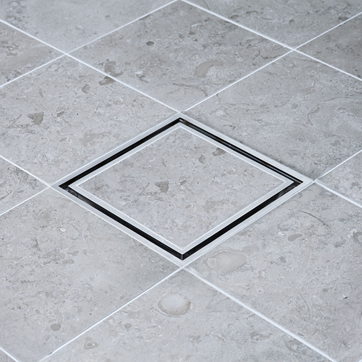 Stilren, syrafast golvbrunnssil med ram för montering av klinker.