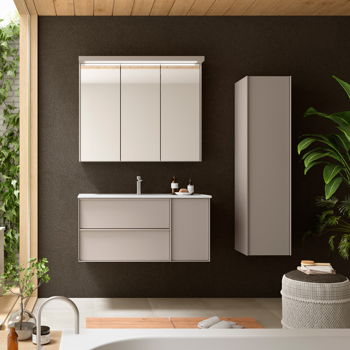 Kommoden levereras utan tvättställ, vilket ger dig friheten att välja en lösning som passar just din stil – oavsett om du föredrar porslin, solid surface eller ett fristående handfat. Den kan kompletteras med: