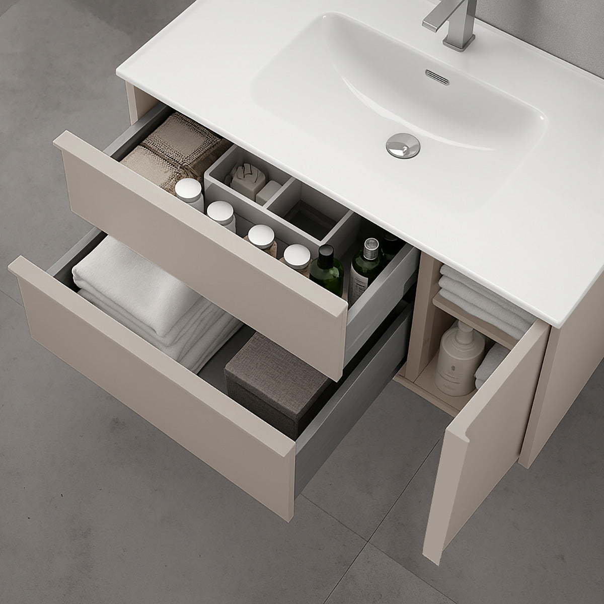 Kommoden är utrustad med två fullt utdragbara lådor samt ett sidomonterat skåp med hylla, vilket ger dig flexibel förvaring för allt från småsaker till flaskor och handdukar. Alla lådor och dörrar har: