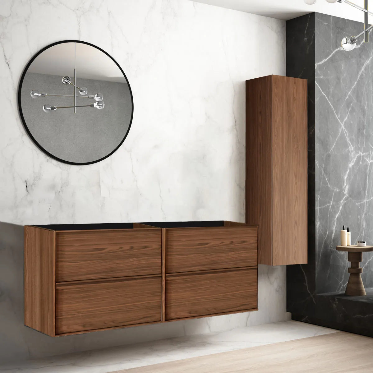 Högskåpen i serien mäter 35x140 cm och har ett djup på 35 cm, vilket gör dem perfekta för både små och stora badrum. De erbjuder rymliga hyllplan och mjukstängande dörrar, vilket ger praktisk och flexibel förvaring för handdukar och andra badrumstillbehör. Den dolda upphängningen ger en minimalistisk och svävande effekt, vilket underlättar rengöring och bidrar till en luftig känsla.