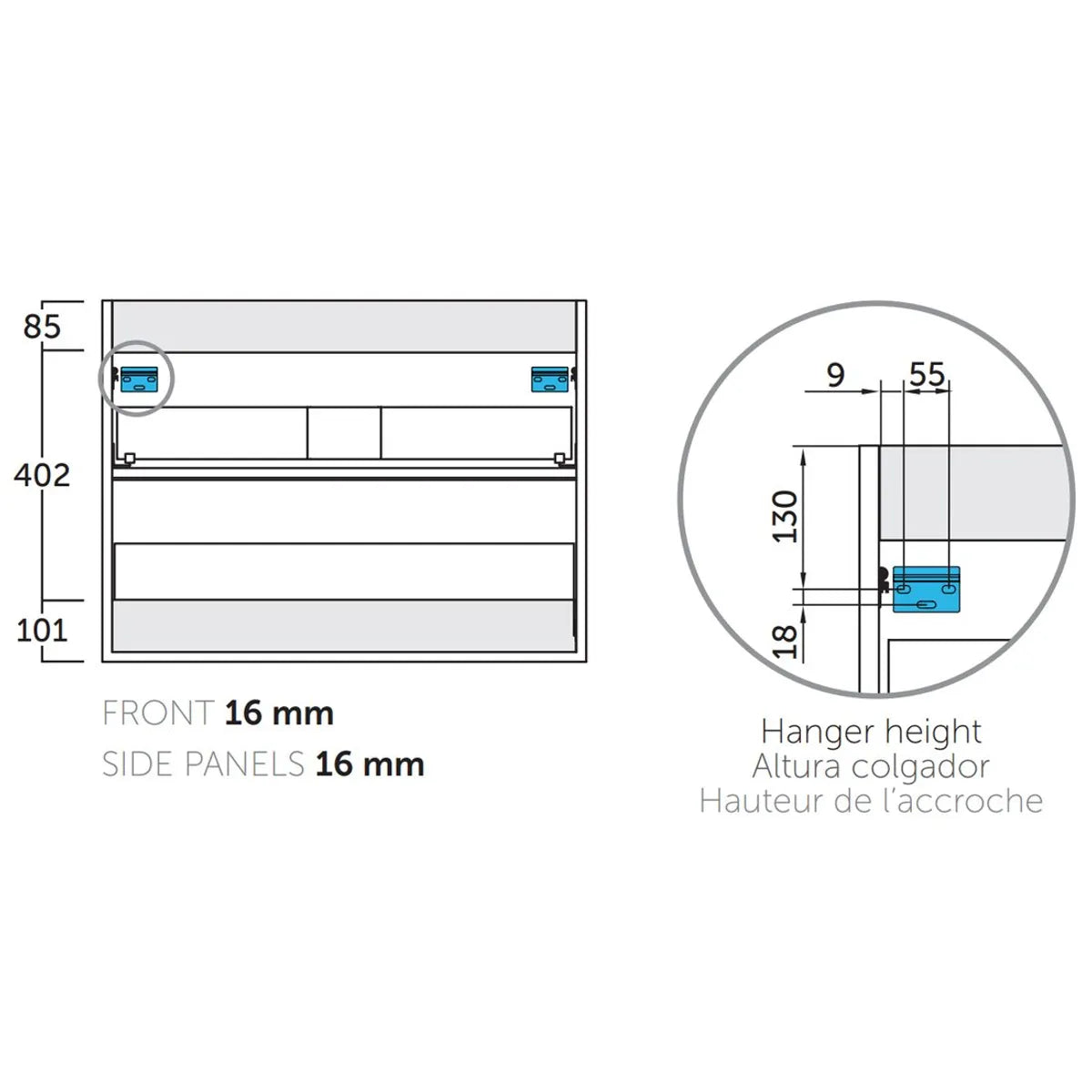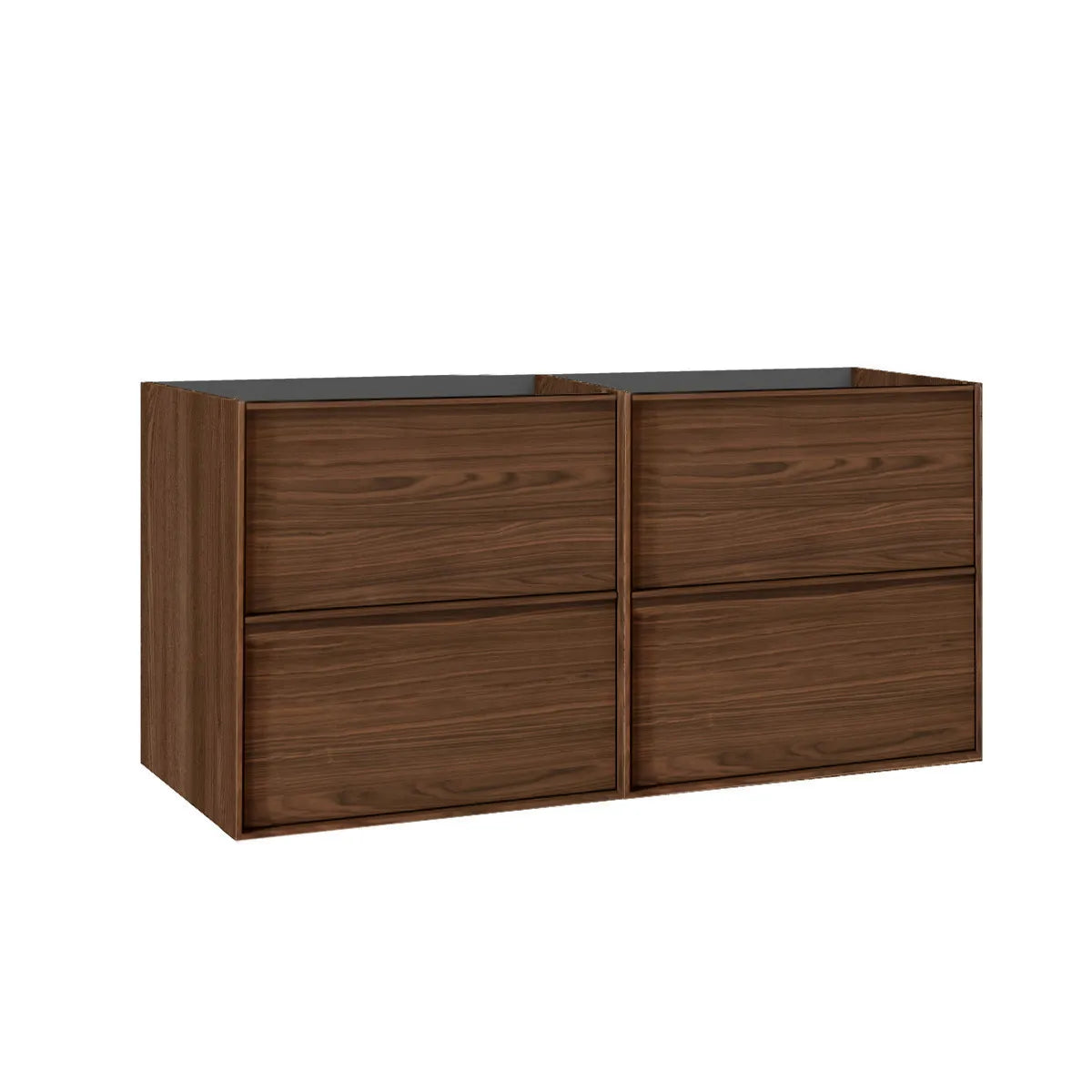 Kommoderna i serien finns i två bredder, 60 cm och 80 cm, vilket ger flexibilitet för olika badrumsstorlekar. Med ett djup på 46 cm och en höjd på 59 cm erbjuder de tillräckligt med förvaringsutrymme utan att dominera rummet. De är utrustade med två rymliga lådor med mjukstängande mekanismer, vilket gör dem både praktiska och tystgående. Lådornas greppkanter, tillverkade i samma material och finish som resten av möbeln, bidrar till en enhetlig och modern look.