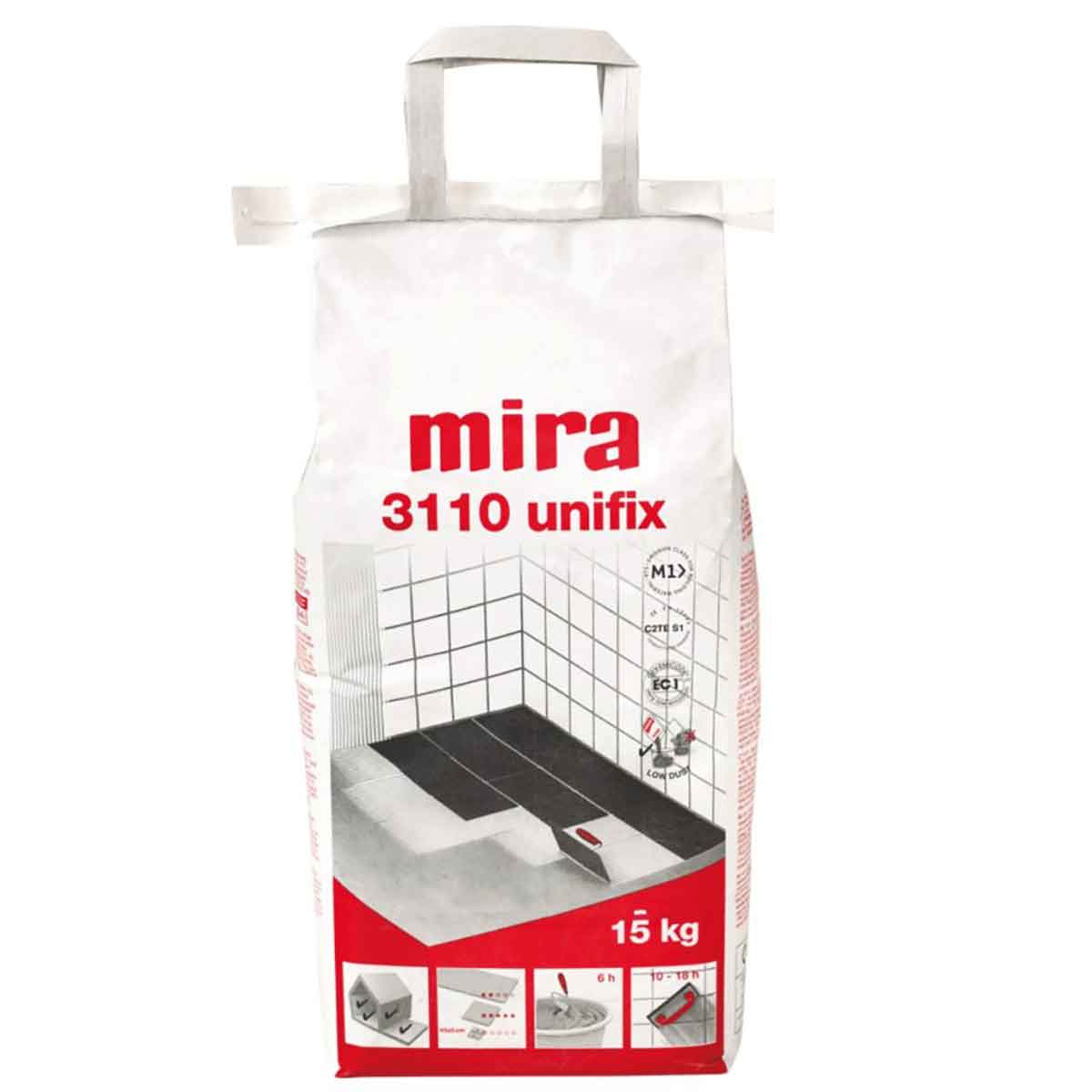 Fästmassa Mira 3110 Unifix Dammreducerad 15 kg är en cementbaserad, plastförstärkt, vit fästmassa för golv och vägg, inom- och utomhus, i våta och torra utrymmen.