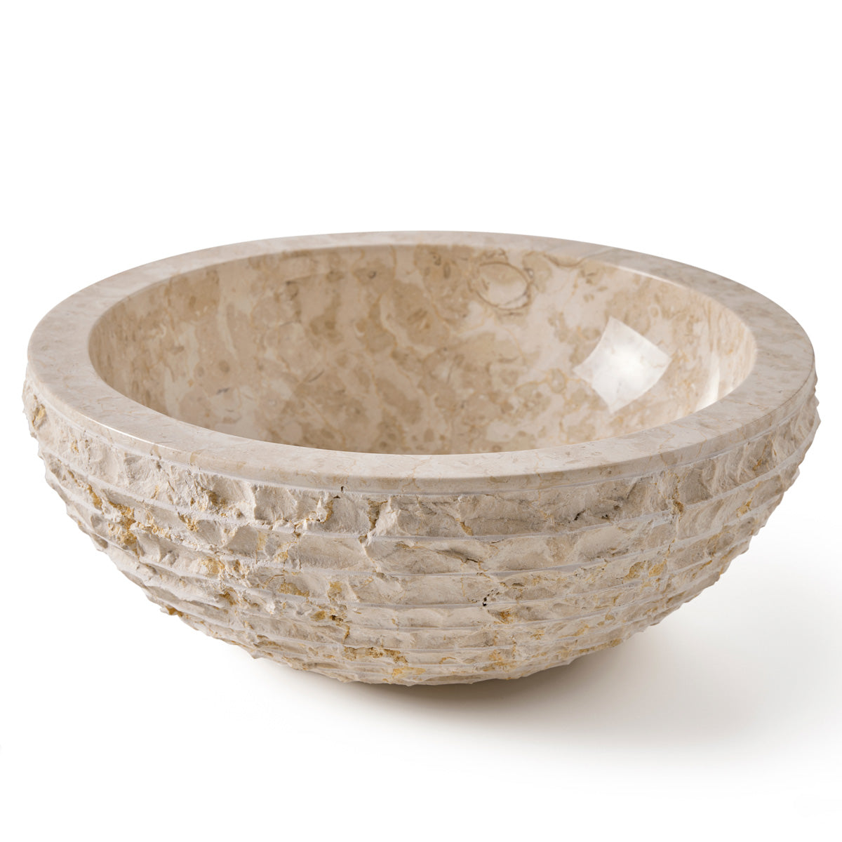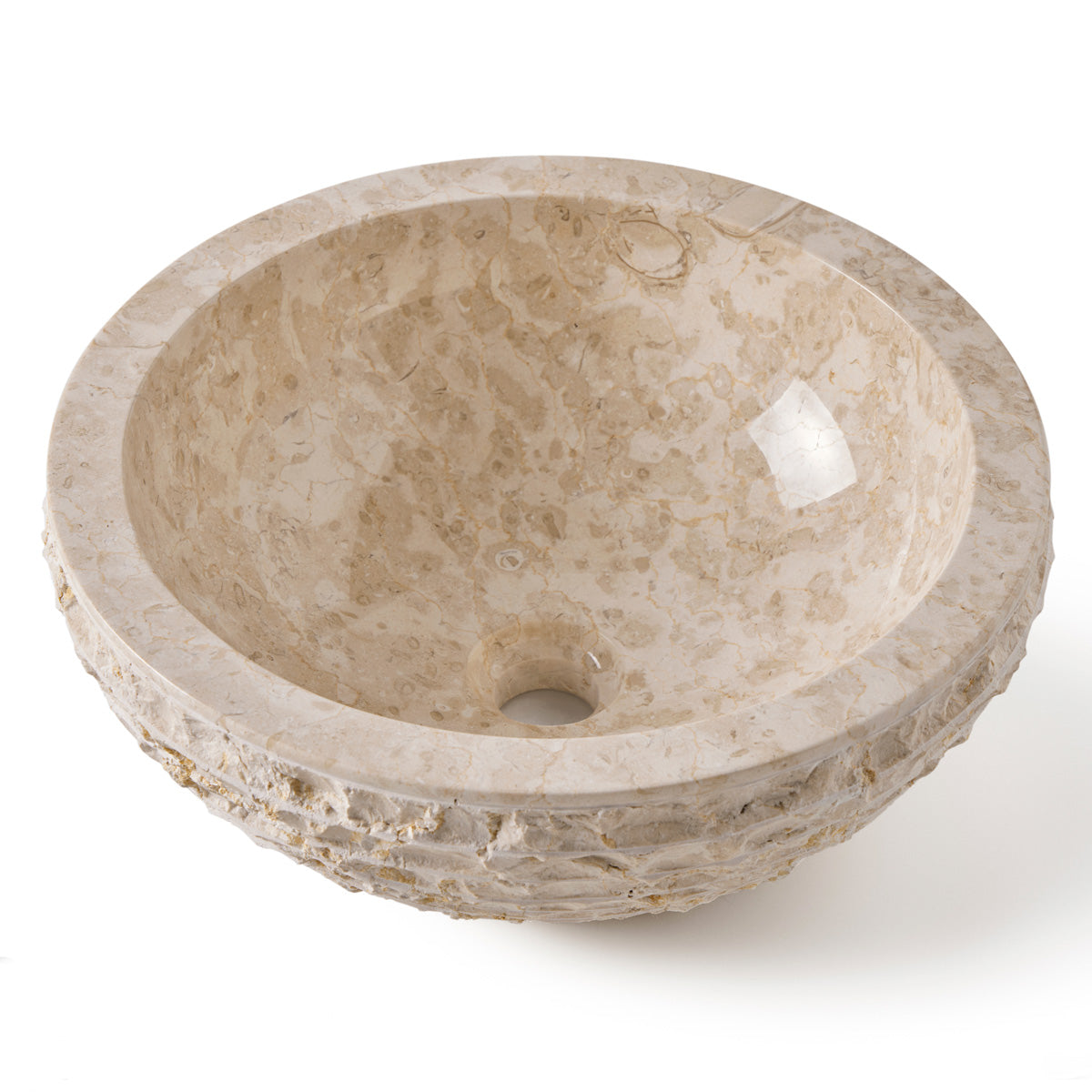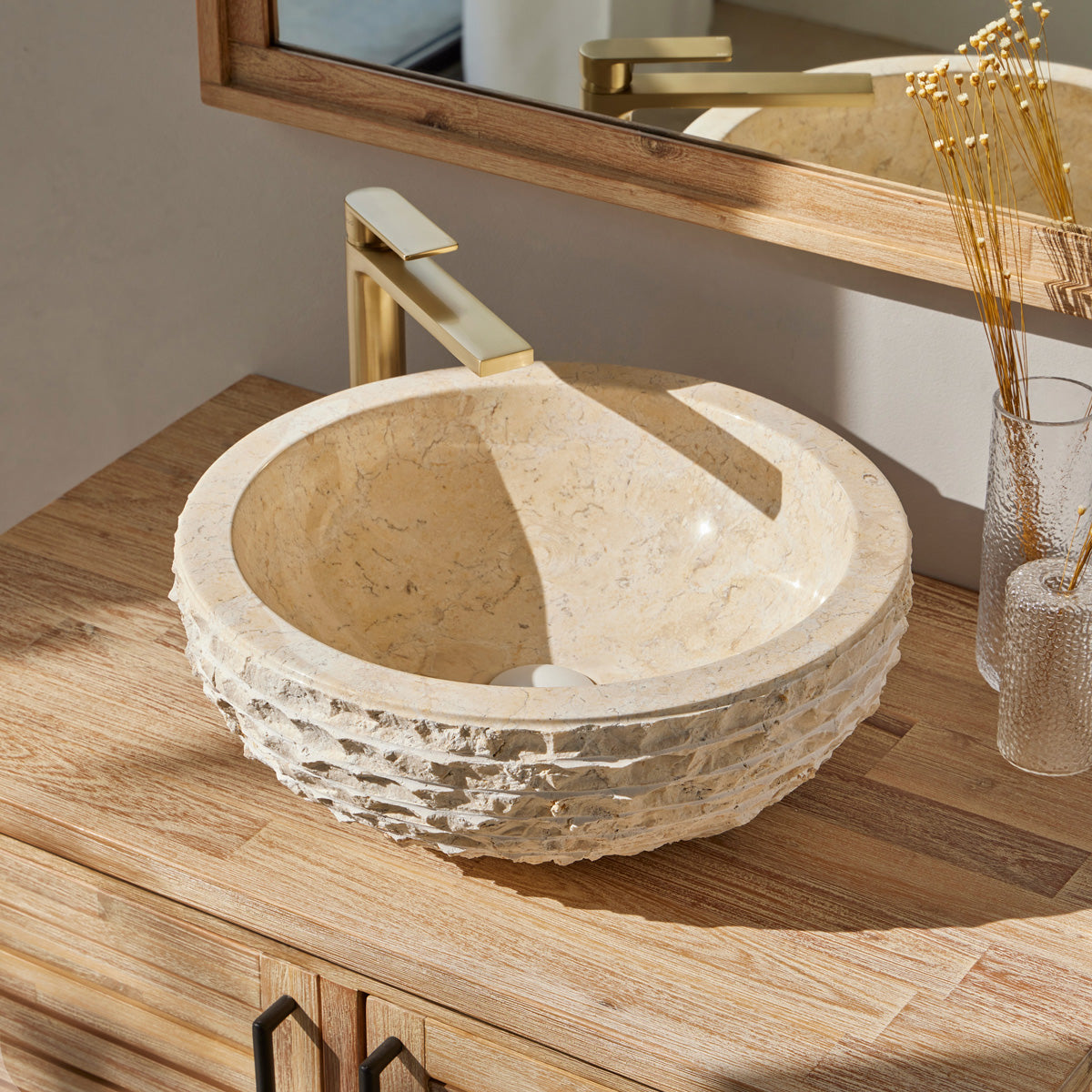 Tvättställ Sandsten är ett handbearbetat tvättställ i äkta marmor, tillverkat av 100% natursten med traditionell stenhuggarteknik. Varje exemplar är unikt och formar en perfekt balans mellan naturlig råhet och sofistikerad design. Den bearbetade, strierade utsidan ger ett robust och autentiskt uttryck, medan den släta, blankpolerade insidan framhäver stenens naturliga glans och struktur. Ett elegant tvättställ som tillför värme, karaktär och exklusivitet till badrummet.