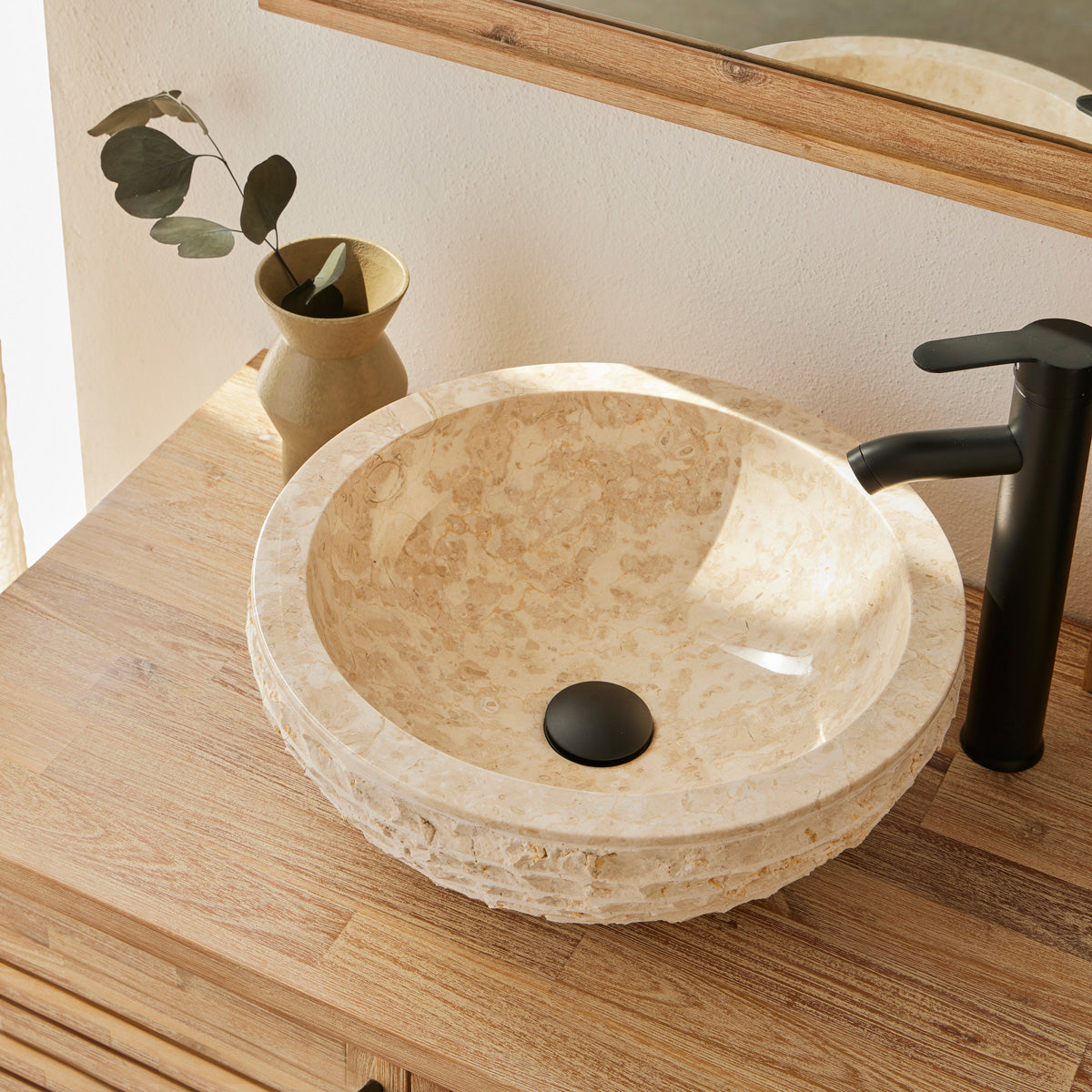 Tvättställ Sandsten kombinerar naturens egna mönster med klassiskt hantverk. Den varma marmorn och den mjuka, rundade formen skapar ett harmoniskt uttryck som lyfter badrummets inredning. Matcha gärna med en tvättställsblandare i borstad mässing, krom eller svart för en exklusiv helhet. Ett tvättställ som förmedlar genuin kvalitet, tidlös skönhet och naturlig balans.