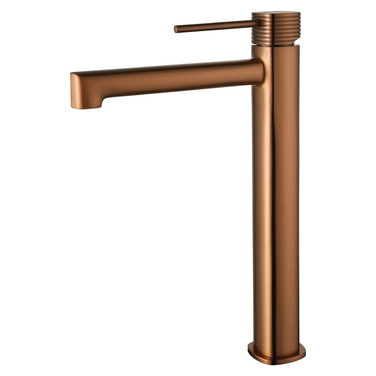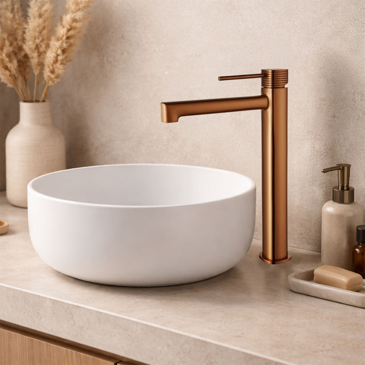 Tvättställsblandare Firenze Hög Borstad Rosé är ett stilfullt val för dig som vill skapa ett badrum med varm, modern och exklusiv känsla. Den borstade roséfärgade ytan ger blandaren ett mjukare och mer sofistikerat uttryck än klassisk blank metall, samtidigt som den tillför en tydlig designkänsla till rummet. Det som särskilt utmärker modellen är den dekorativa toppen med sina markerade horisontella ränder, en genomarbetad detalj som ger blandaren karaktär och lyfter fram serien Firenze på ett elegant sätt. I borstad rosé får både formen och dekoren ett harmoniskt och exklusivt uttryck som passar perfekt i trendmedvetna badrum.