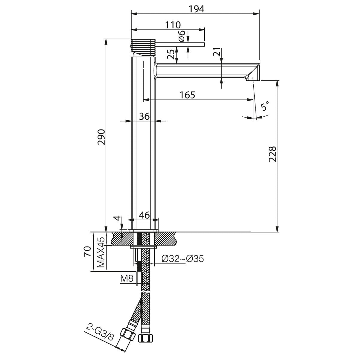 Tvättställsblandaren är tillverkad i mässing och utrustad med en keramisk patron på Ø26 mm, vilket bidrar till jämn manövrering och pålitlig funktion över tid. Den levereras med 3/8" anslutningsslangar och är anpassad för ett monteringshål på cirka Ø32–35 mm. Blandaren har en total höjd på 290 mm, ett piputsprång på 165 mm och en total längd på 194 mm. Höjden till pipens underkant är 228 mm, vilket gör modellen särskilt lämpad för fristående tvättställ där extra utrymme behövs. Den höga designen ger en väl avvägd kombination av komfort, funktion och stilren proportion.