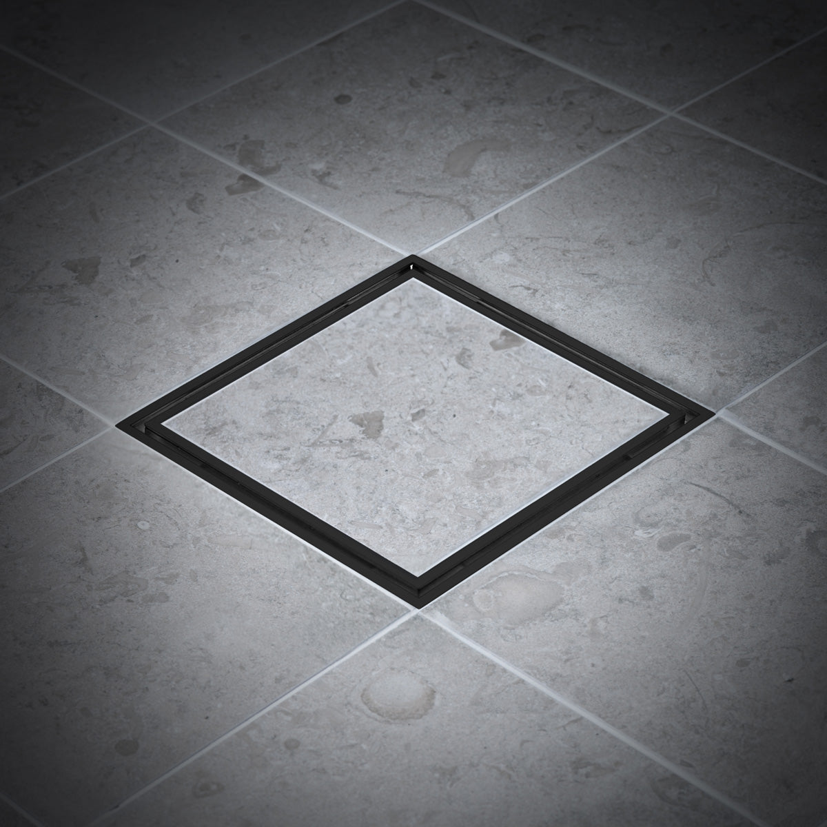 Stilren matt svart, pulverlackerad golvbrunnssil med ram för montering av klinker.